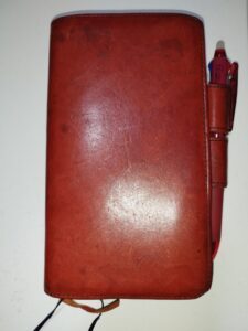 そして、10年以上使ひ込んだ、昔のランドセルみたいな赤いセミオーダーの手帳カバーは角とかが丸くなつたり、革のしおりがグリグリになつて、パッと見るには、もうヨレヨレ。